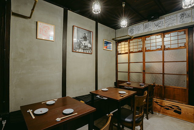 木の温もりとシンプルな設えが調和した、落ち着きのあるテーブル席。磨き上げられた木肌と柔らかな灯りが古民家ならではの静かな安らぎを演出。会話を愉しみながら、肩の力を抜いて過ごせる、上質な時間をお届けします。