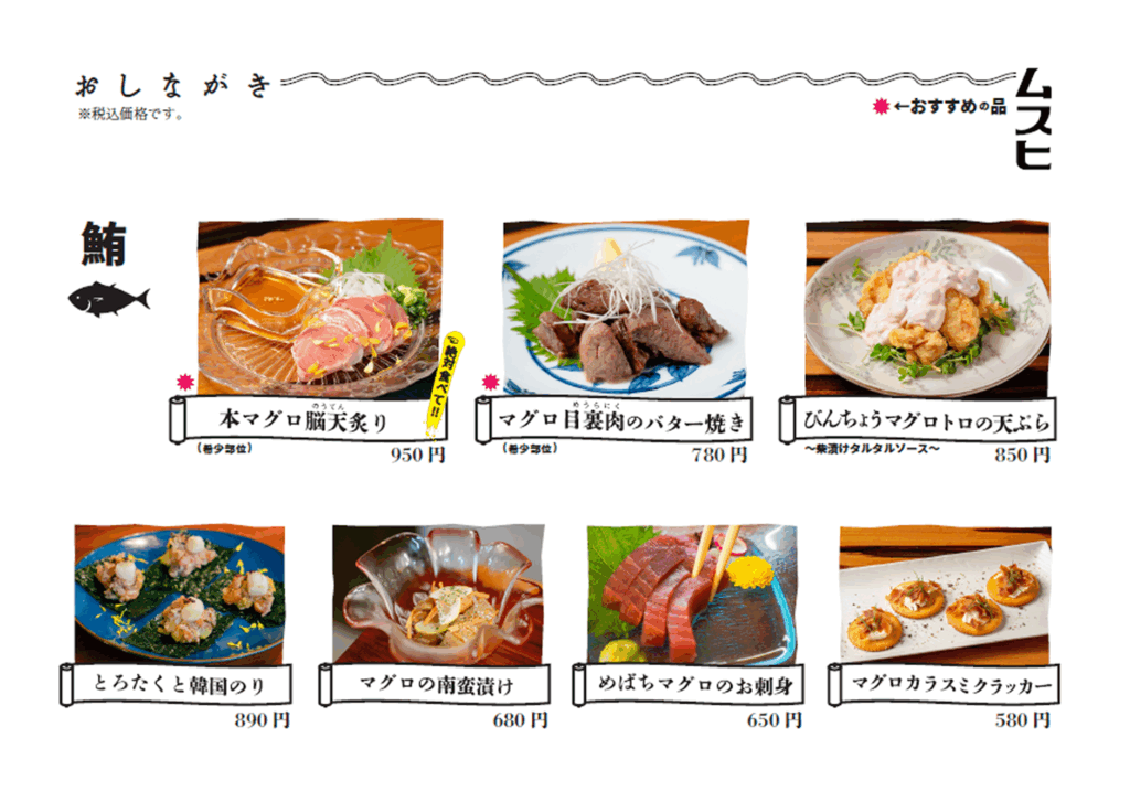 ①マグロの南蛮漬け②明太子ポテサラ③本マグロ脳天の炙り④マグロ目裏肉のバター焼き⑤びんちょうマグロトロの天ぷら 〜しば漬けタルタルソース〜⑥ネギトロごはん⑦バニラアイス
