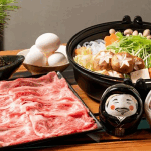①マグロ南蛮漬け②アテ3種盛り③すき焼き鍋 ④〆こだわりもっちり麺 ⑤デザート