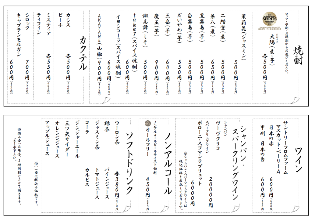 お席は2時間制となります。